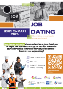 Job dating régional + Ajouter à mon Agenda Google + Exportation iCal / Outlook 00 jours 00 heures 00 minutes 00 secondes Date 26 Mar 2026 Heure 9h00 - 17h00 Lieu Le Cube EIC Au croisement des rues de l'Alma et du Dragon, 59200 Tourcoing Partagez cet événement